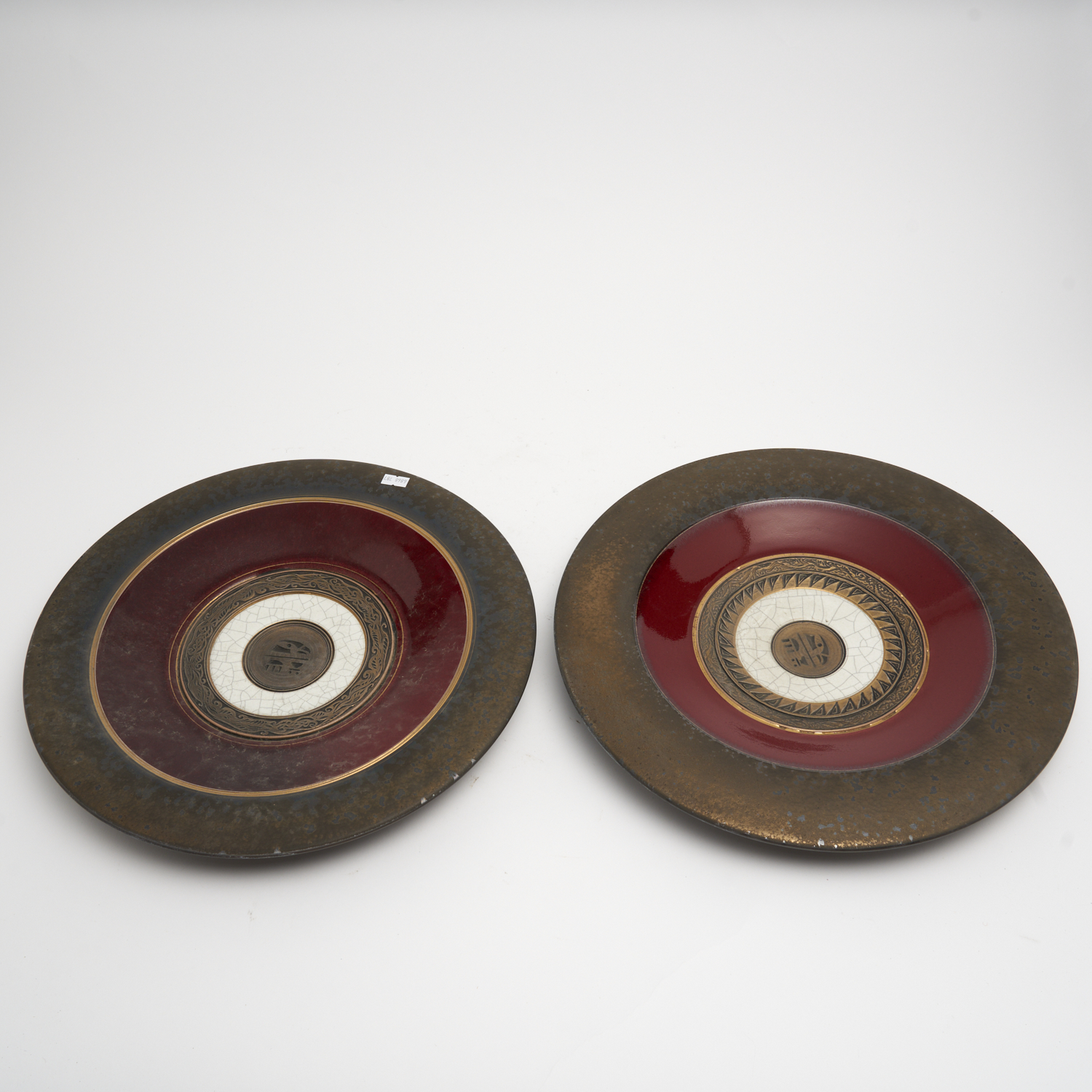 A PAIR OF GLAZED CERAMIC PLATTERS BY DAVID OSWALD, STAMPED TO BASE DIA.60.5CM