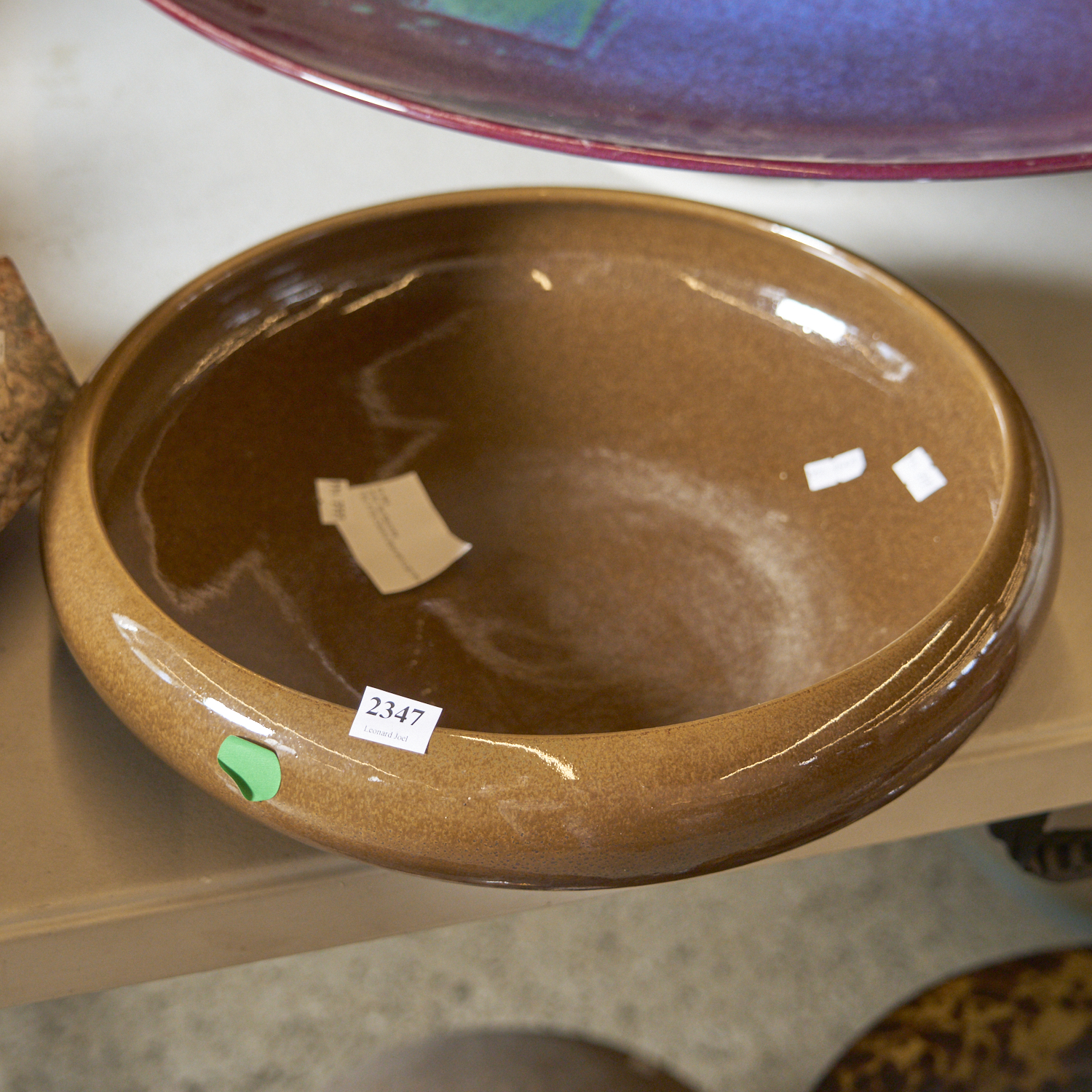 A SHALLOW CERAMIC BOWL WITH A LIGHT BROWN GLAZE BY TED SECOMBE (UNSIGNED) H.10CM DIAMETER: 38CM