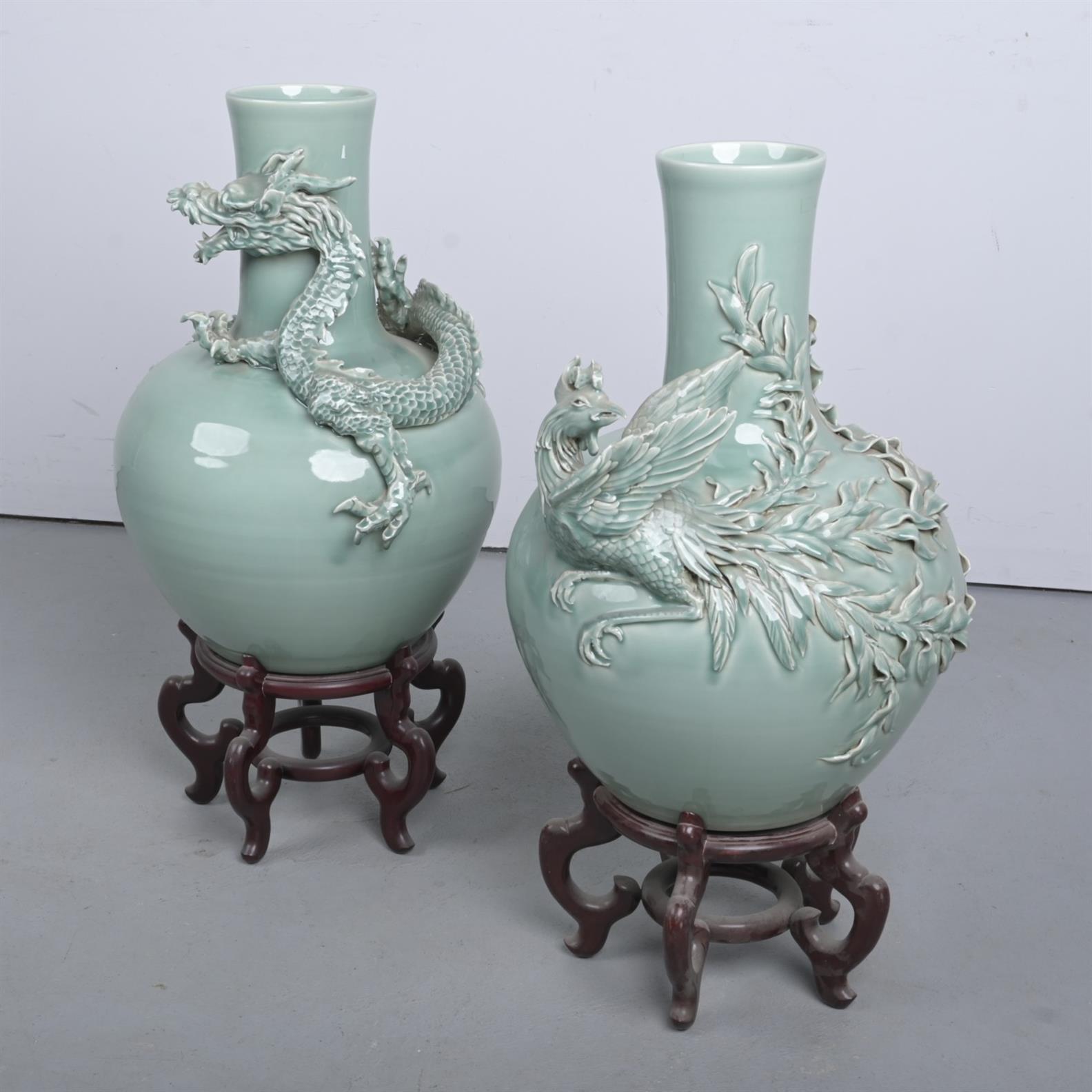 A PAIR OF CHINESE CERAMIC VASES ON STANDS, ONE WITH DRAGON THE OTHER WITH PHEONIX (80H X 47DIA CM)