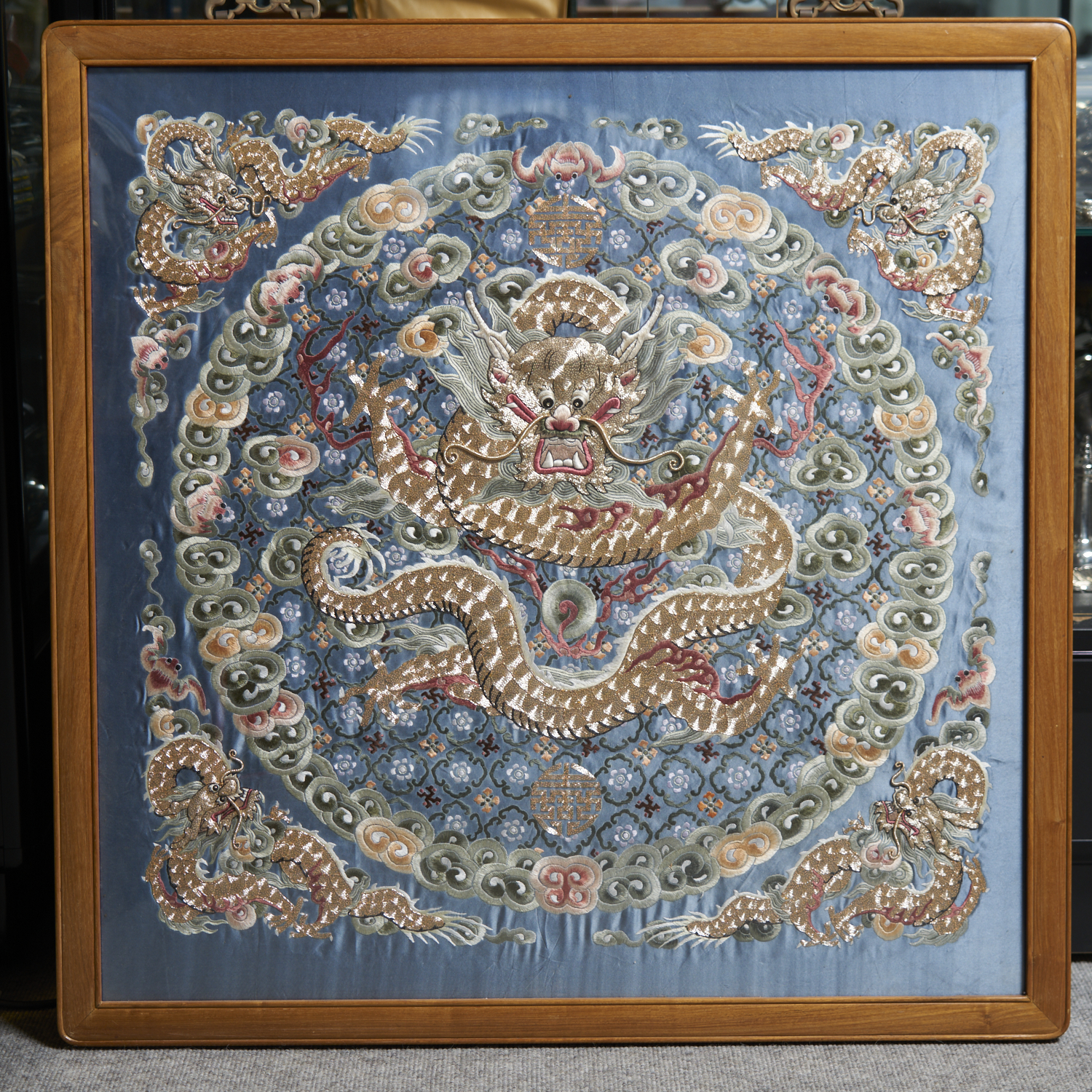 A FRAMED CHINESE SILK AND SILVER EMBROIDERED SQUARE WITH A CENTRAL DRAGON AND FOUR OTHERS TO EACH CORNER, 20TH CENTURY 87 X 87CM