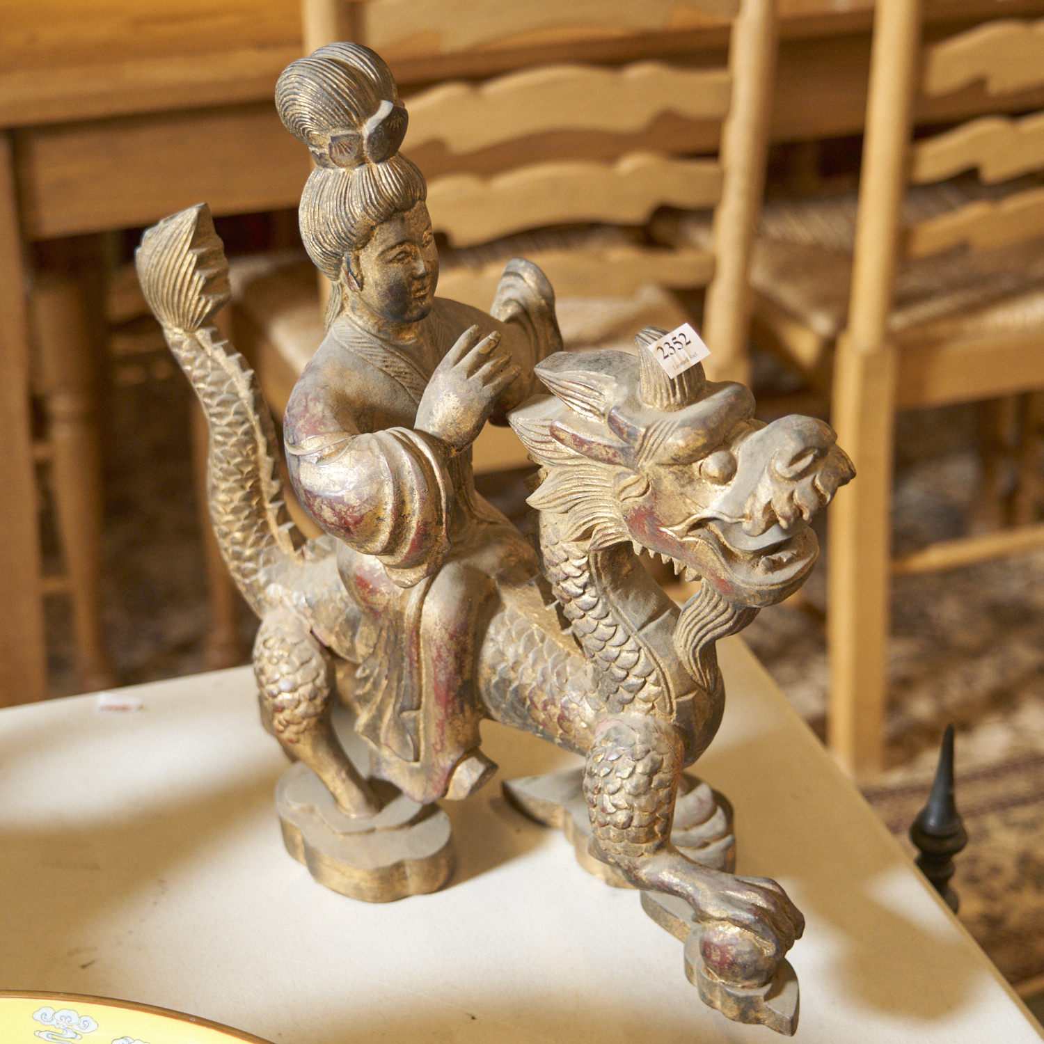 A CHINESE GILTWOOD FIGURE OF A MAN RIDING A DRAGON H.44CM