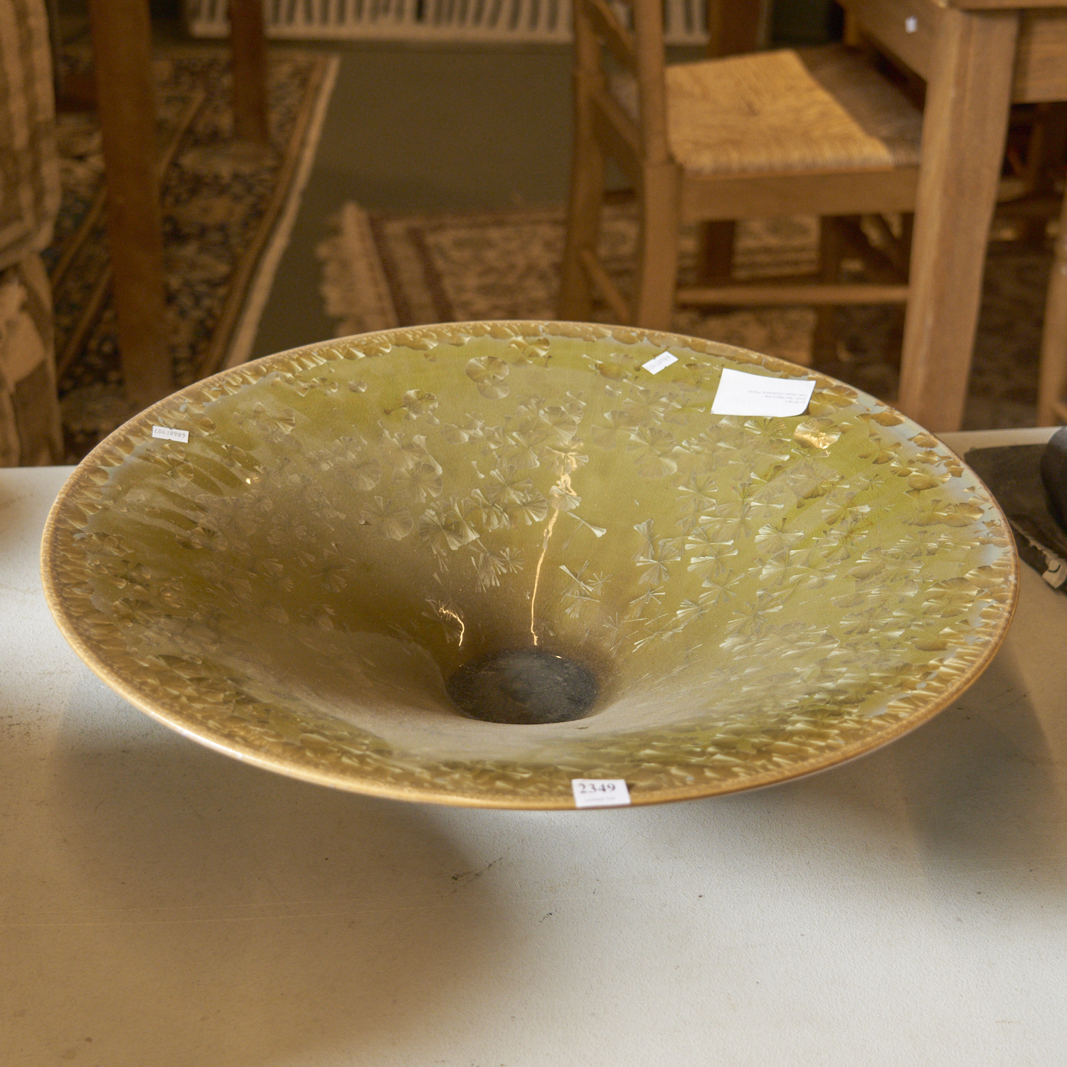 A LARGE GREEN CRYSTALLINE GLAZED PLATTER BY TED SECOMBE DIA.56CM
