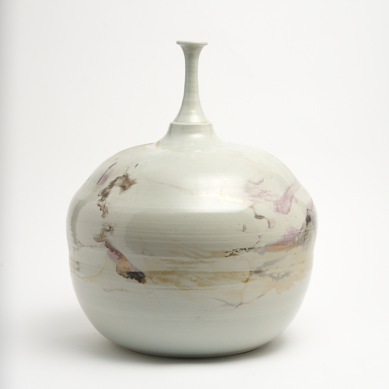 A LARGE GLAZED POTTERY VESSEL WITH THIN BOTTLE, ILLEGIBLE SIGNATURE TO BASE H.45CM
