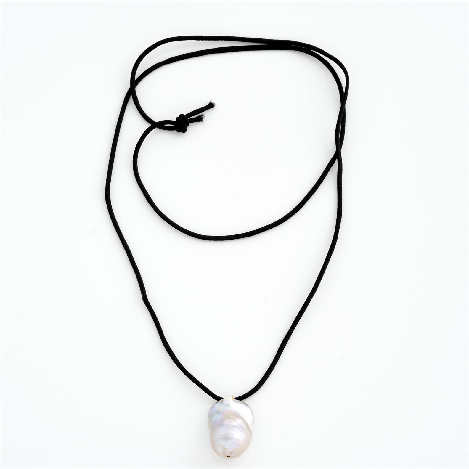 A BAROQUE PEARL PENDANT NECKLACE, THE PEARL MEASURING APPROXIMATELY 22 X 15MM, TO A LEATHER CORD