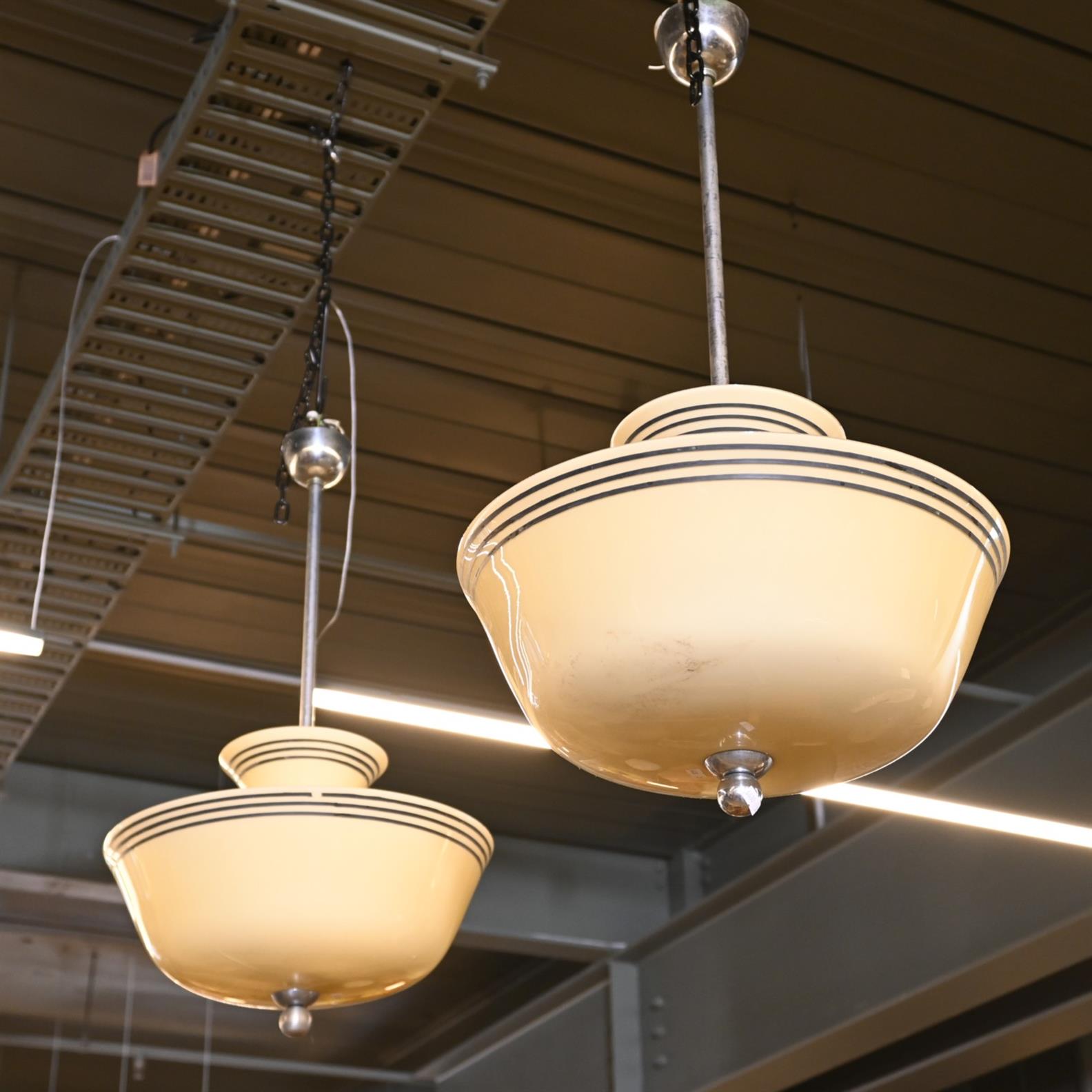 A PAIR OF 1930s ENGLISH ART-DECO GLASS PENDANT LIGHTS (CRACK TO GLASS) (A/F) (82H X 39DIA CM)