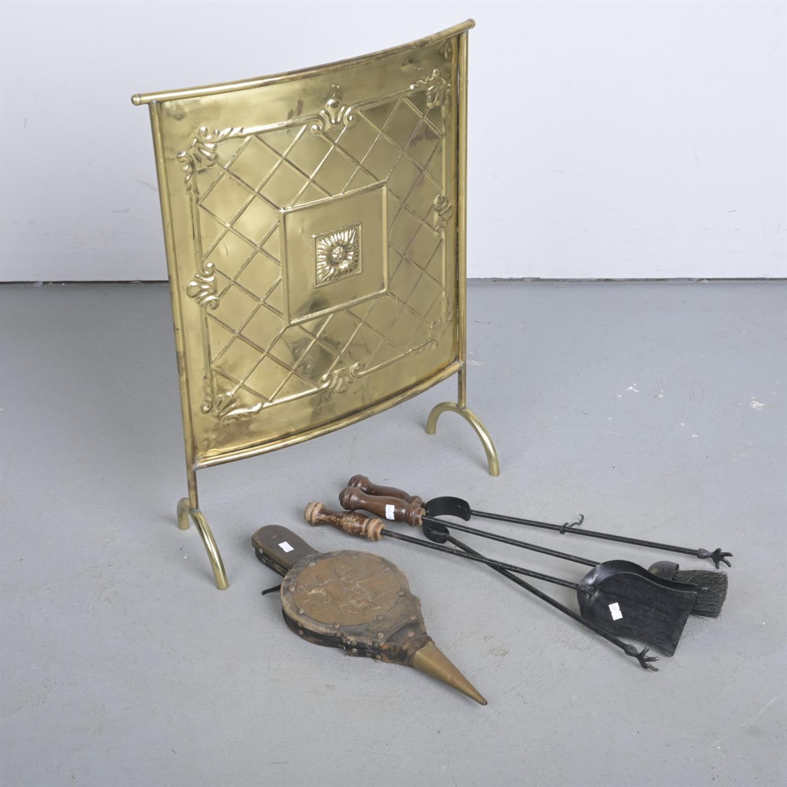 A BRASS FIRE SCREEN WITH A COLLECTION OF FIRE TOOLS (H67 AND SMALLER)