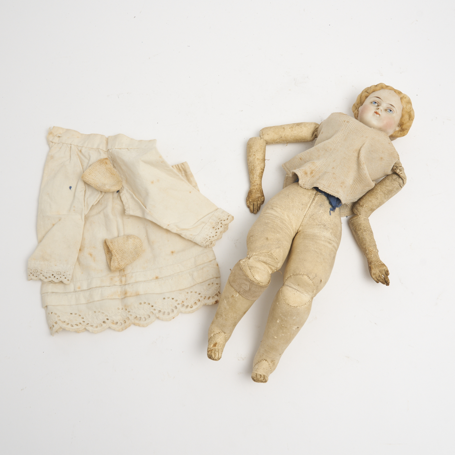 A 19TH CENTURY GERMAN OR FRENCH PORCELAIN HEAD DOLL WITH SAWDUST LEATHER BODY, ACCOMPANIED WITH ORIGINAL GARMENTS L.37CM