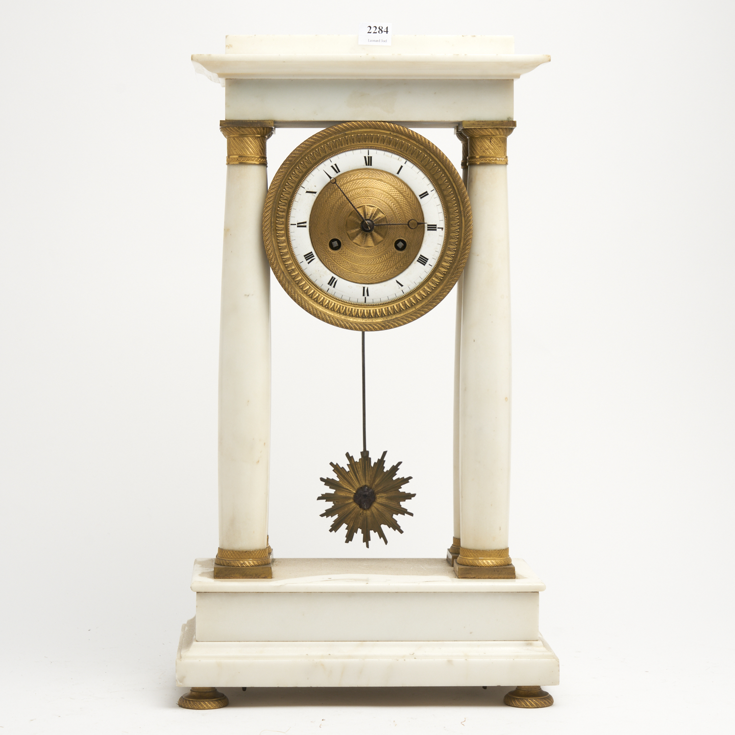 A WHITE MARBLE PORTICO CLOCK WITH PENDULUM H.52CM