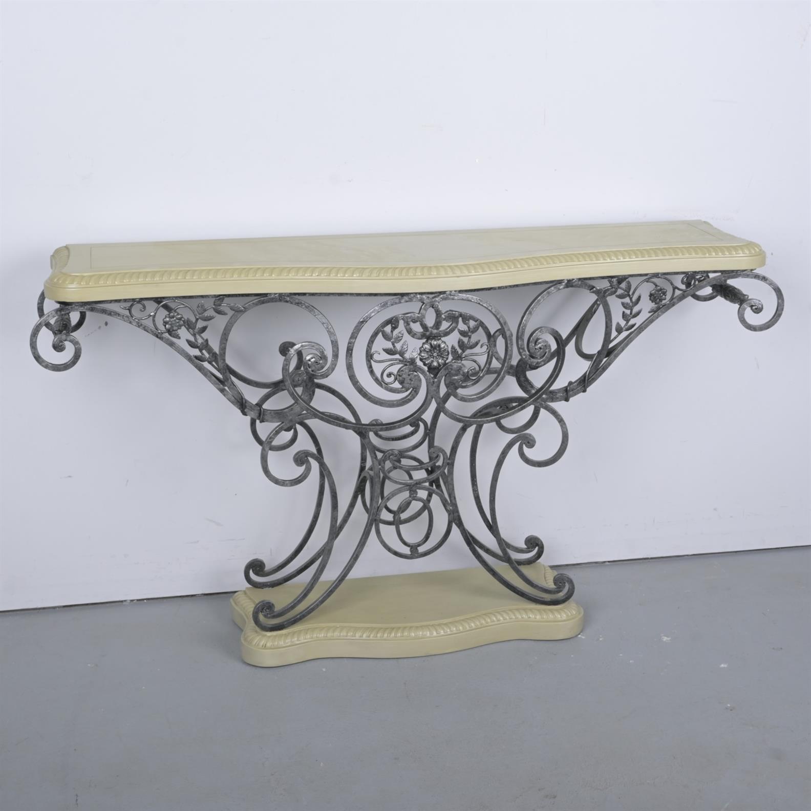 A WROUGHT IRON AND PAINTED TIMBER SIDE TABLE (94H X 159W X 41D CM) (THIS ITEM MUST BE REMOVED BY CARRIERS AT THE CUSTOMER'S EXPENSE. LEONARD JOEL STAFF CANNOT ASSIST CARRYING THIS ITEM.)