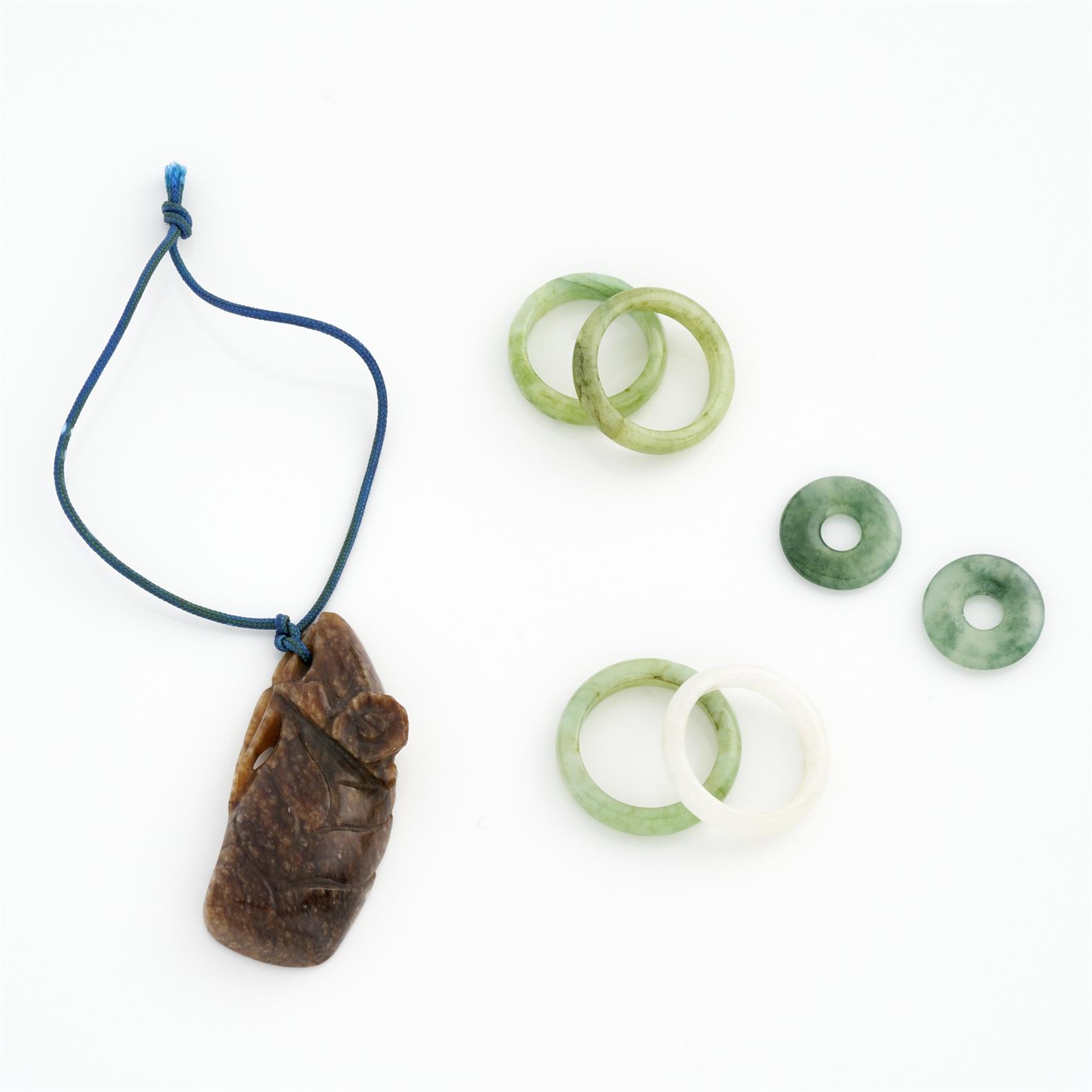 A COLLECTION OF JADE JEWELLERY, COMPRISING THREE PENDANTS AND FOUR RINGS, SIZES J - N