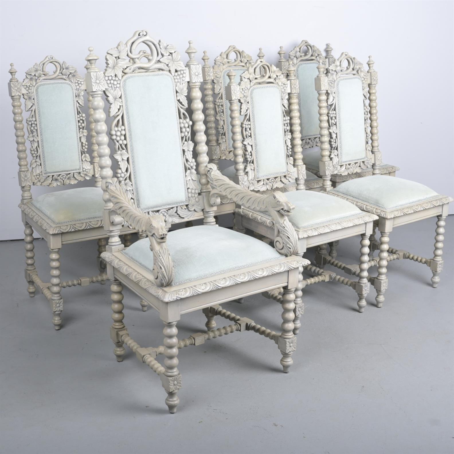 SET OF SEVEN VICTORIAN OAK DINING CHAIRS IN PAINTED FINISH, INCLUDING ONE ELBOW CHAIR (A/F) (122H X 61W X 57D CM) (THIS ITEM MUST BE REMOVED BY CARRIERS AT THE CUSTOMER'S EXPENSE. LEONARD JOEL STAFF CANNOT ASSIST CARRYING THIS ITEM.)