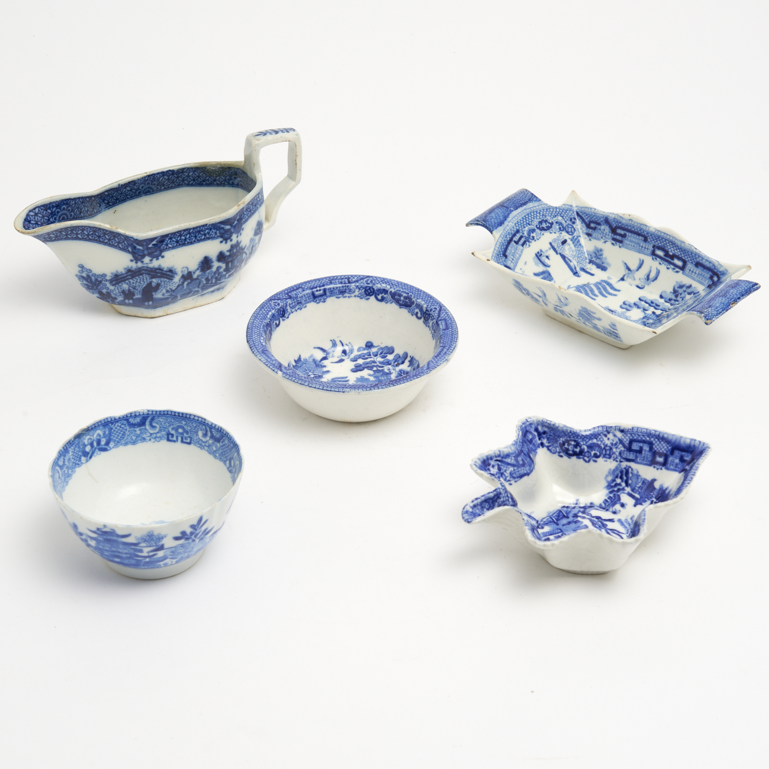 A GROUP OF LATE 18TH/EARLY 19TH BLUE AND WHITE PORCELAIN INCLUDING FOUR PIECES OF WILLOW PATTERN AND A PEARLWARE JUG (A/F) W.17CM (JUG)