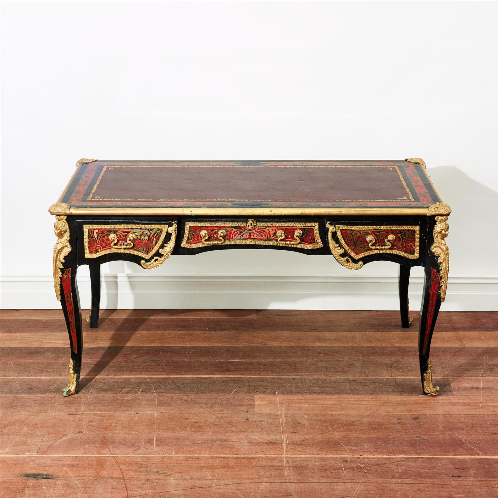 A NAPOLEON III STYLE BOULLE BUREAU PLAT, WITH LEATHER TOP, GILT METAL MOUNTS, THREE DRAWERS ON CABRIOLE LEGS WITH ESPAGNOLETTE CHUTES