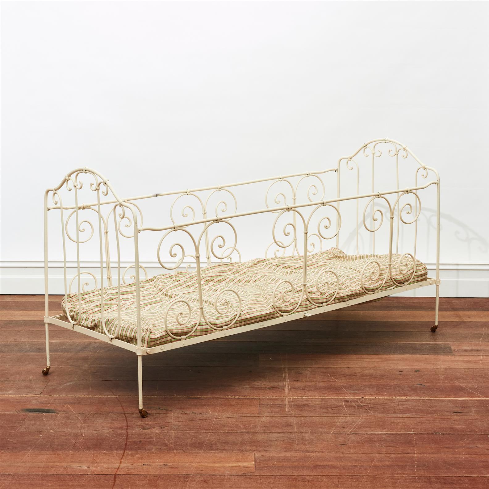 A FRENCH WROUGHT IRON FOLDING COT, ON BRASS CASTORS