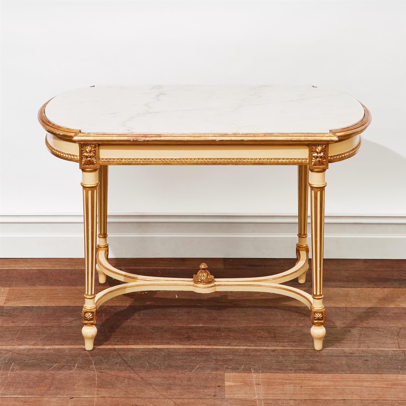 A CREAM AND GILT DECORATED CENTRE TABLE WITH WHITE MARBLE TOP IN THE LOUIS XVI STYLE