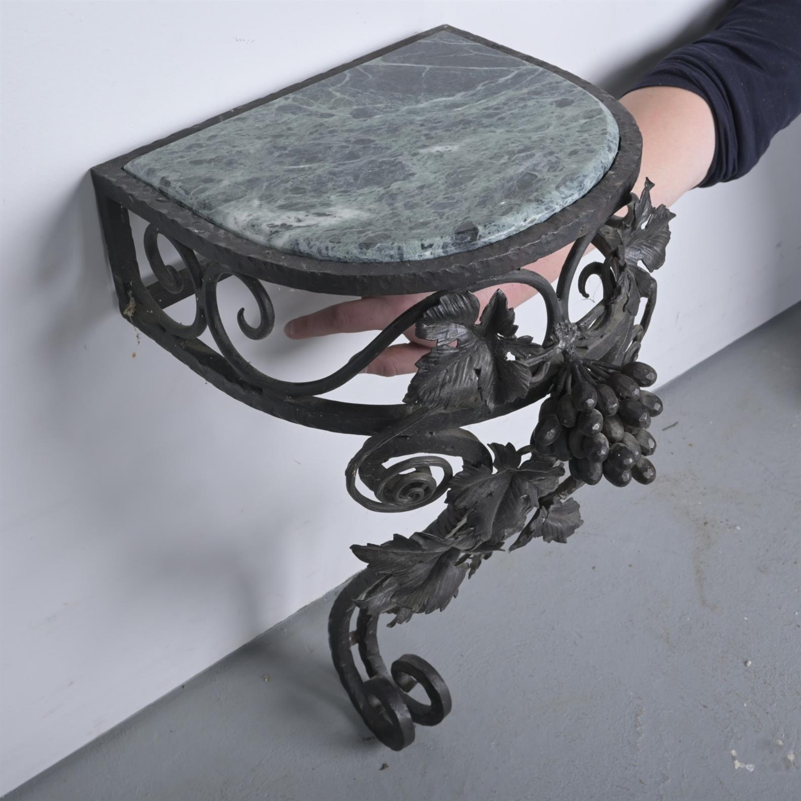 A SMALL WROUGHT IRON CONSOLE WITH MARBLE TOP (62H X 31W X 37D CM)