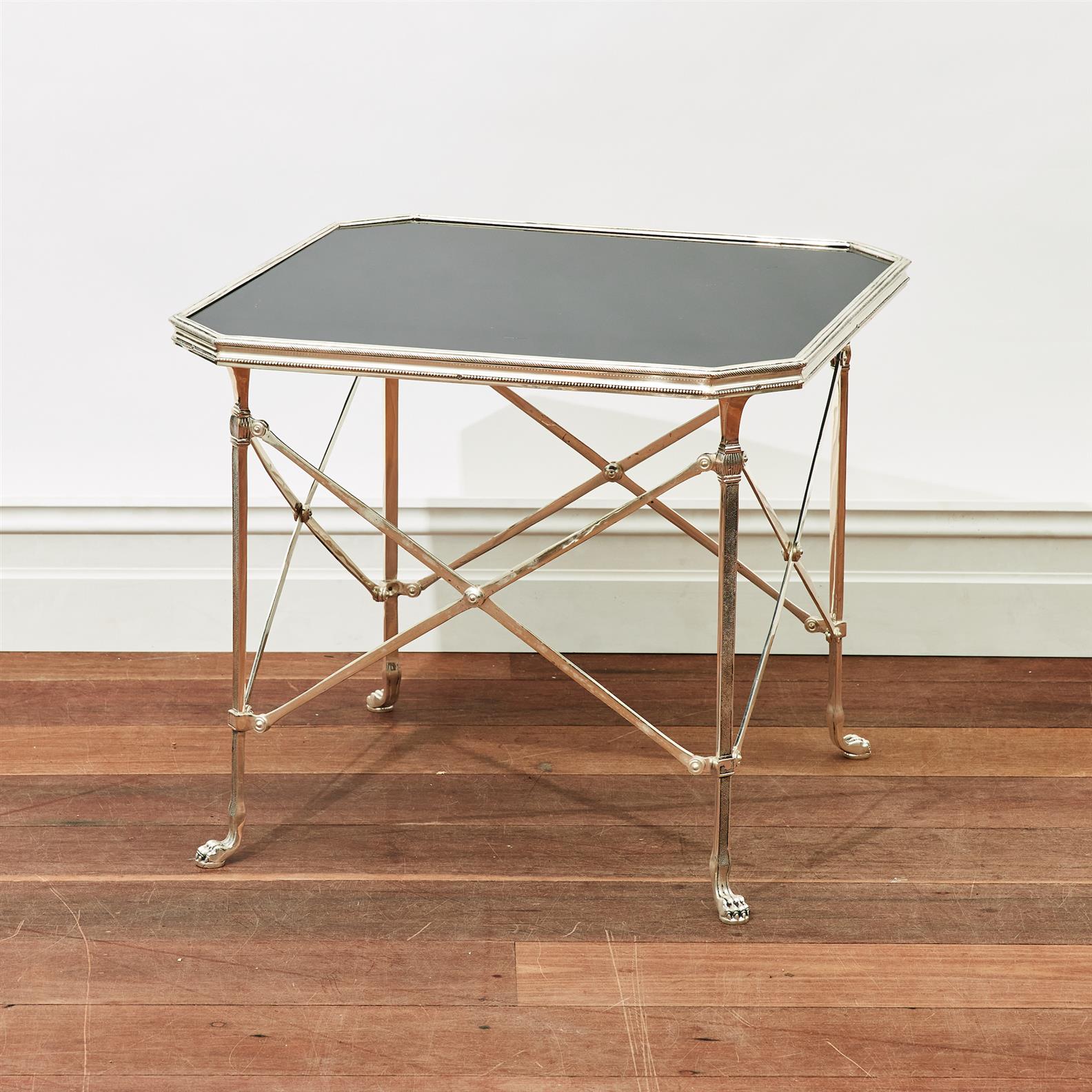EICHHOLTZ AMSTERDAM: 'MONTE CARLO' OCCASIONAL TABLE, THE SQUARE BLACK GLASS TOP ON CHROMIUM NEOCLASSICAL STYLE SUPPORTS