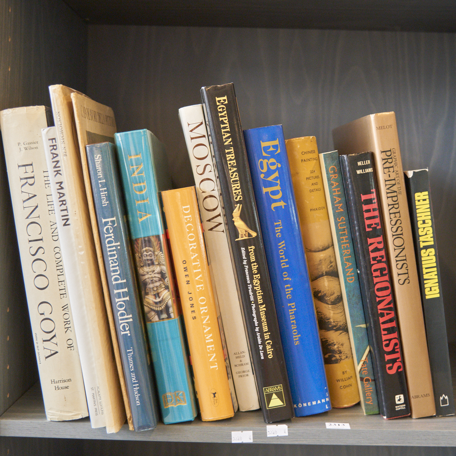 A SHELF OF INTERNATIONAL ART REFERENCE INCLUDING CHINESE PAINTING, FRANCISCO GOYA, AND EGYPTIAN TREASURES