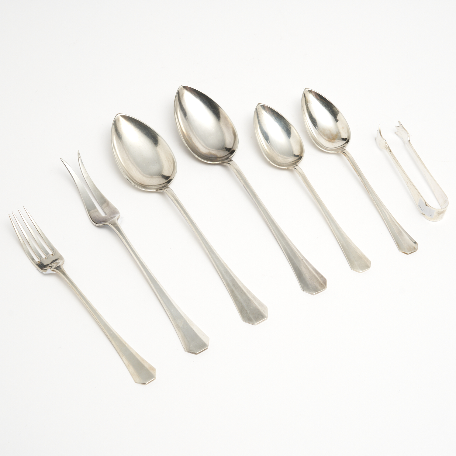 A PART SET OF 800 SILVER SERVING WARE INCLUDING TWO PAIRS OF SERVING SPOONS, TWO FORKS AND TONGS (SOME WITHOUT VISIBLE MARKS) L.27CM (LONGEST) 610G