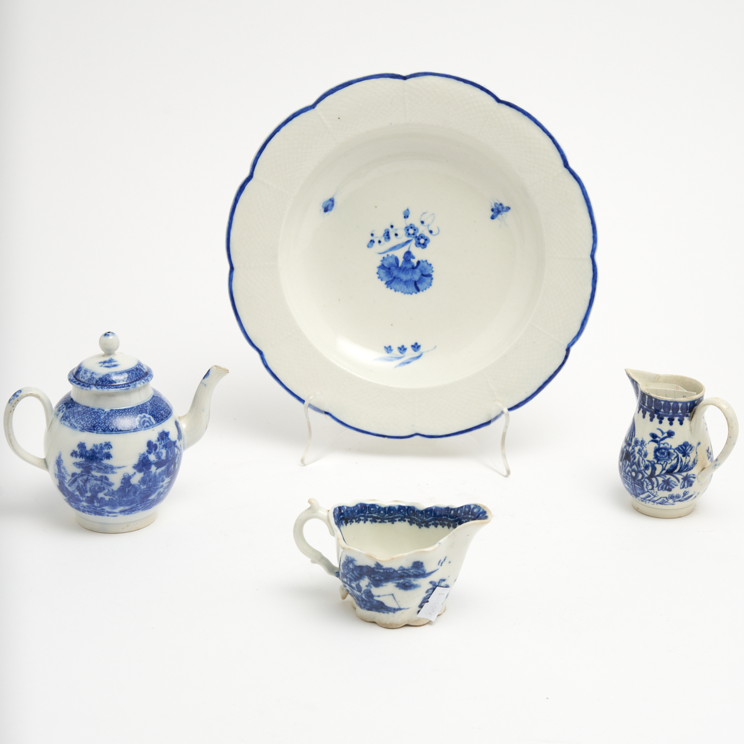 FOUR PIECES OF LATE 18TH CENTURY CAUGHLEY BLUE AND WHITE PORCELAIN INCLUDING A SPARROW BEAK JUG, A CHILD'S TEAPOT, FISHERMEN'S PATTERN EWER AND CARNATION PATTERN DISH (A/F) H.12CM (TEAPOT)