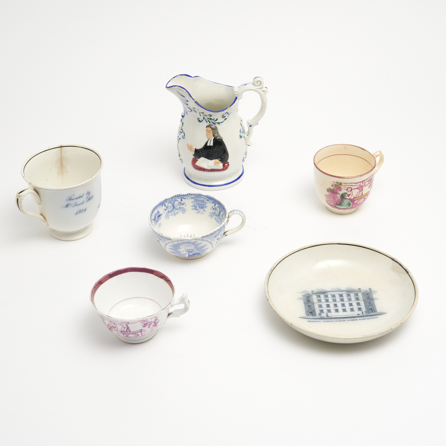 A GROUP OF COMMEMORATIVE PORCELAIN INCLUDING A JUG, TWO 'FAITH AND HOPE' TEACUPS, A BENNET ST SUNDAY SCHOOL TEACUP AND SAUCER AND A WESLEY TEACUP (A/F) H.15CM (TALLEST)