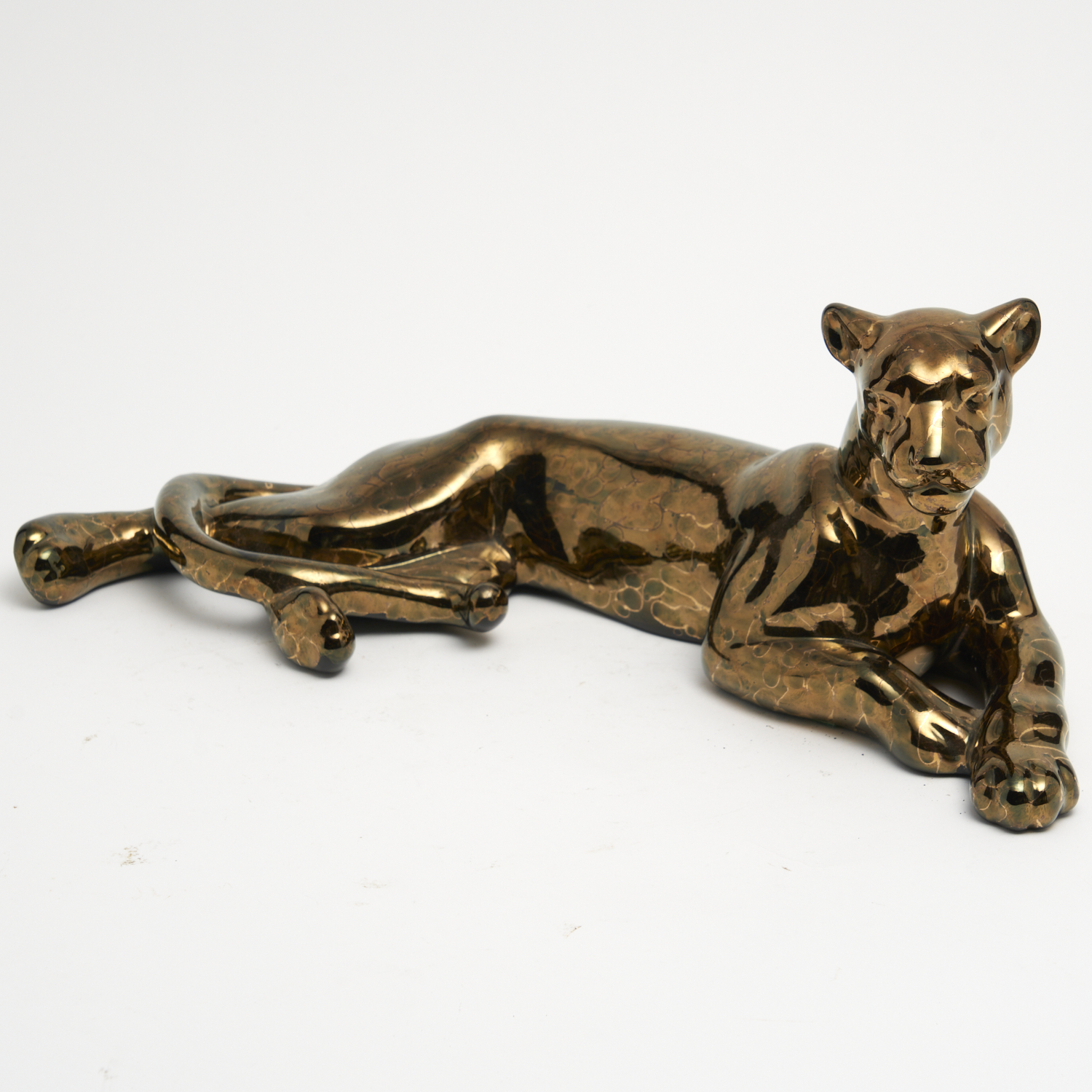 AN AUSTRALIAN RECLINING CHEETAH WITH A METALLIC CRYSTALINE GLAZE BY MAGILL CERAMICS, LABEL TO BASE L.51CM