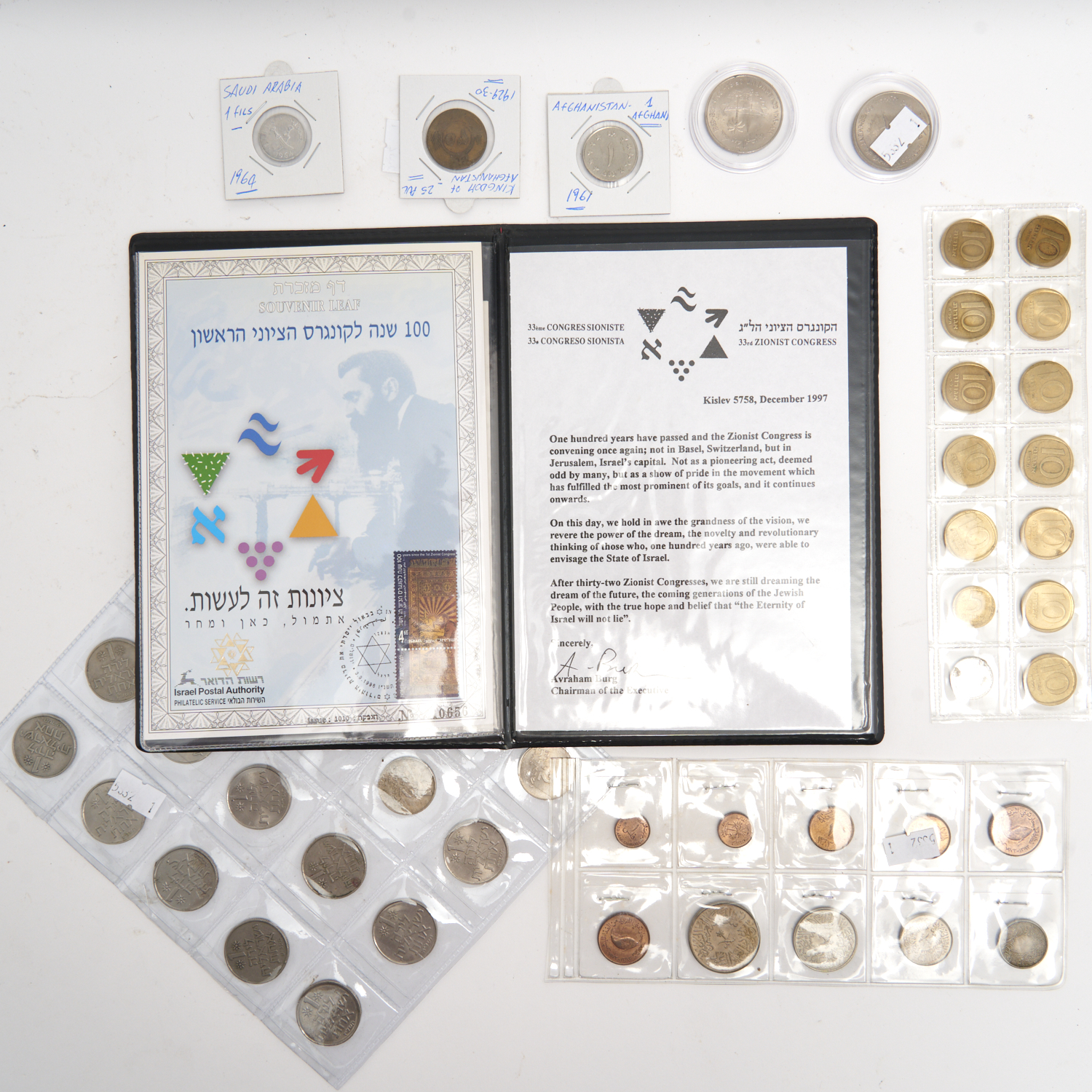 A COLLECTION OF COINS INCLUDING A STAMPS BOOKLET AND A GROUP OF ISRAELI, AFGHANI AND MIDDLE EASTERN COINS