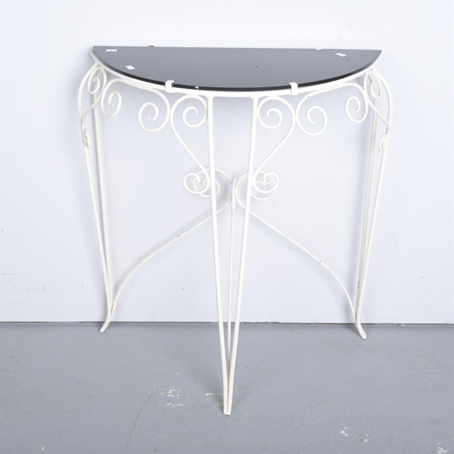 A WHITE WROUGHT STEEL AND BLACK GLASS SEMI ROUND TABLE (73H 60W 26D CM )