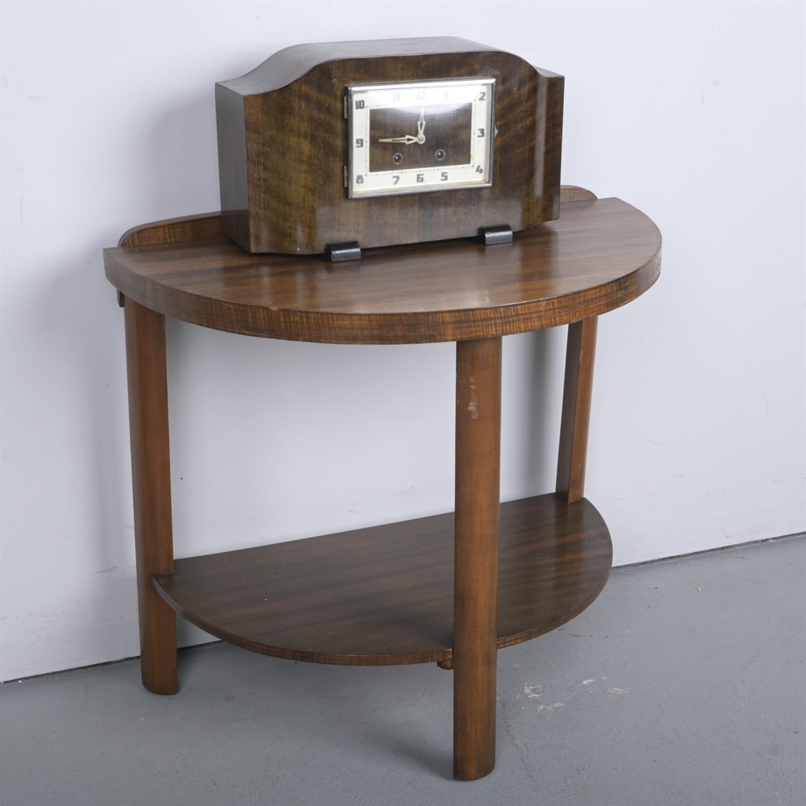 AN ART DECO BLACKWOOD DEMILUNE SIDE TABLE ALONG WITH AN ART DECO CLOCK (AF) ( 66H 70W 40D CM AND SMALLLER )