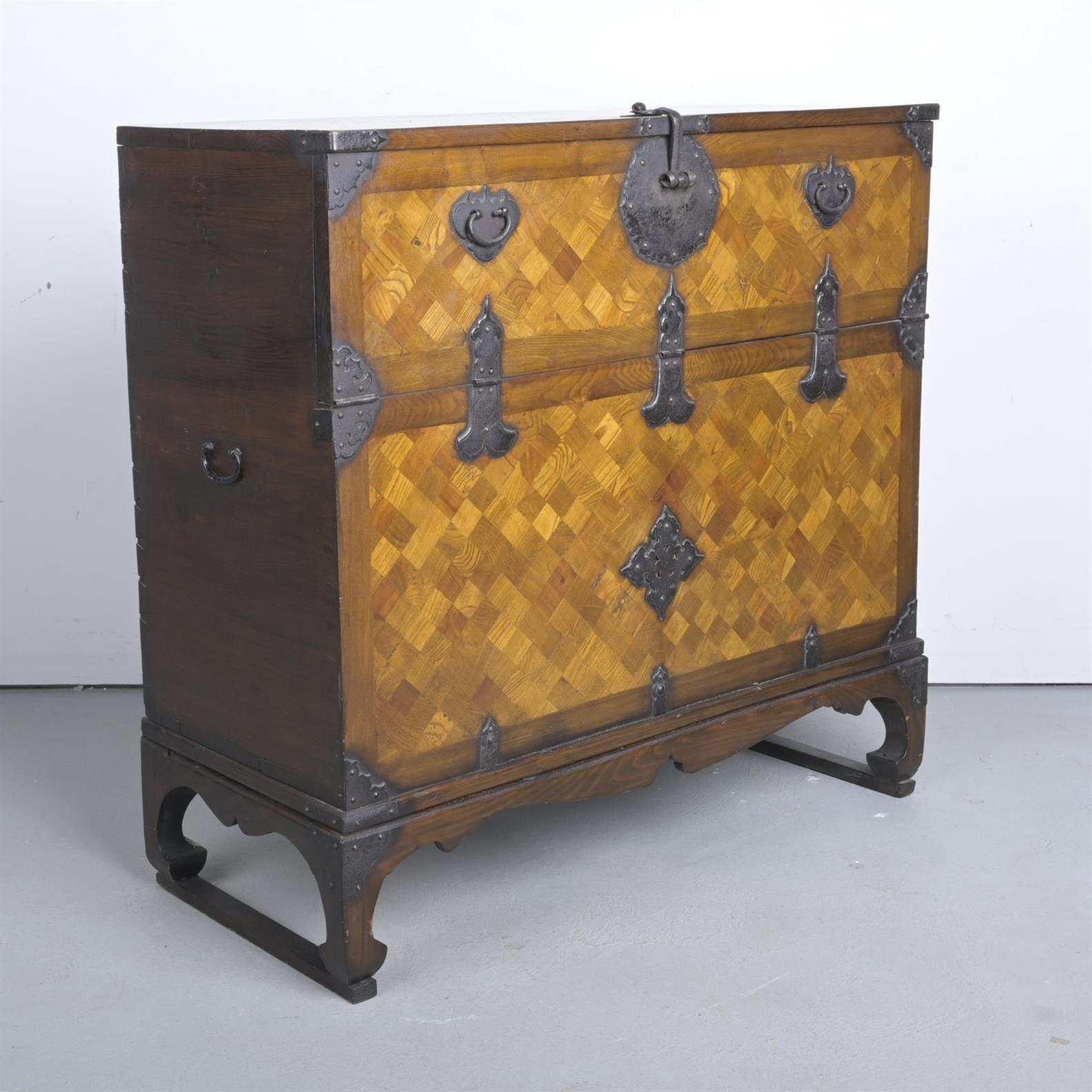 A KOREAN PARQUETRY STORAGE CHEST WITH METAL FIXTURES AND HINGES (104H 106W 47D CM) (THIS ITEM MUST BE REMOVED BY CARRIERS AT THE CUSTOMER'S EXPENSE. LEONARD JOEL STAFF CANNOT ASSIST CARRYING THIS ITEM.)