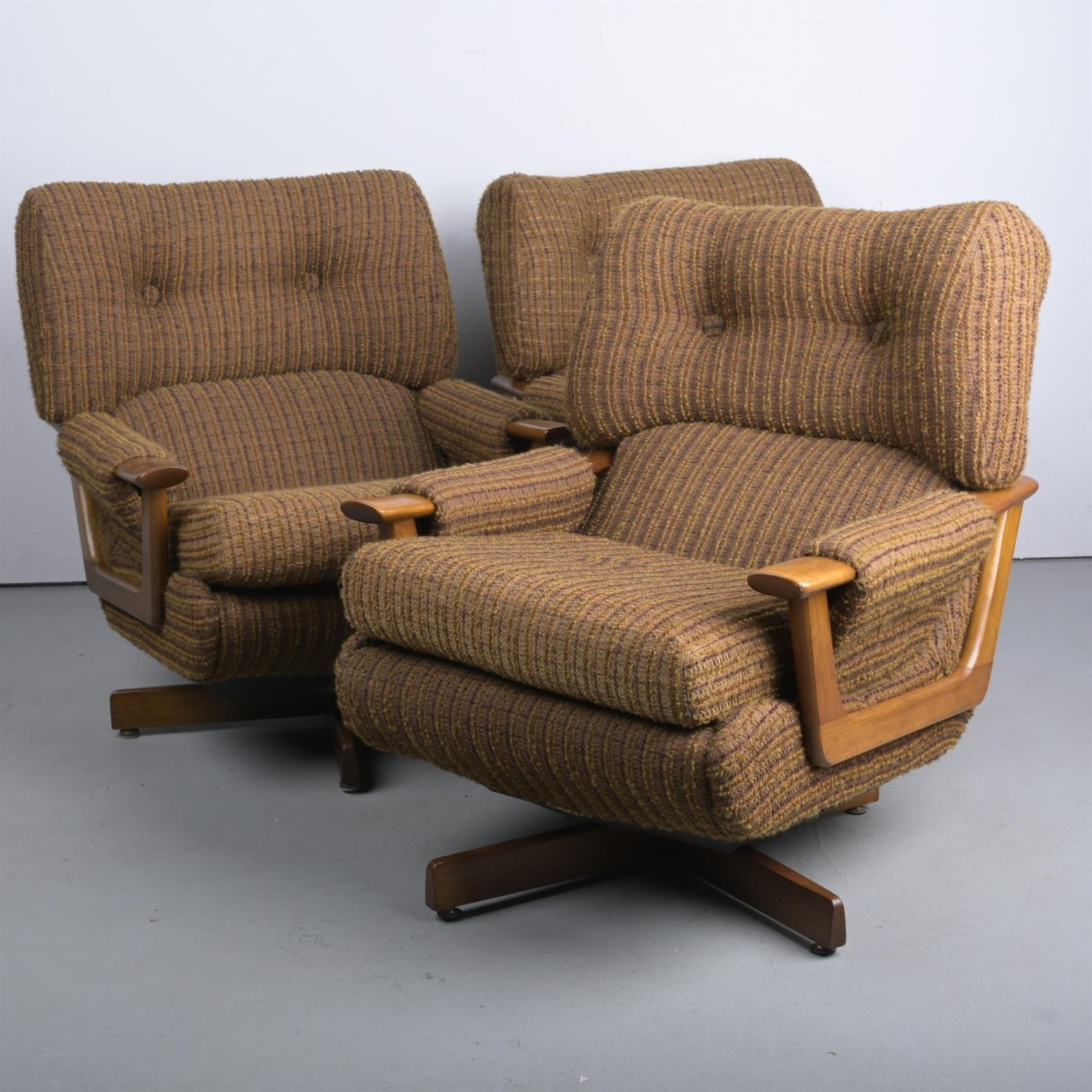 A SET OF THREE T21 TEAK AND TWEED UPHOLSTERED ARM CHAIRS FOR TESSA (96H X 81W X 90D CM) (THIS ITEM MUST BE REMOVED BY CARRIERS AT THE CUSTOMER'S EXPENSE. LEONARD JOEL STAFF CANNOT ASSIST CARRYING THIS ITEM.)