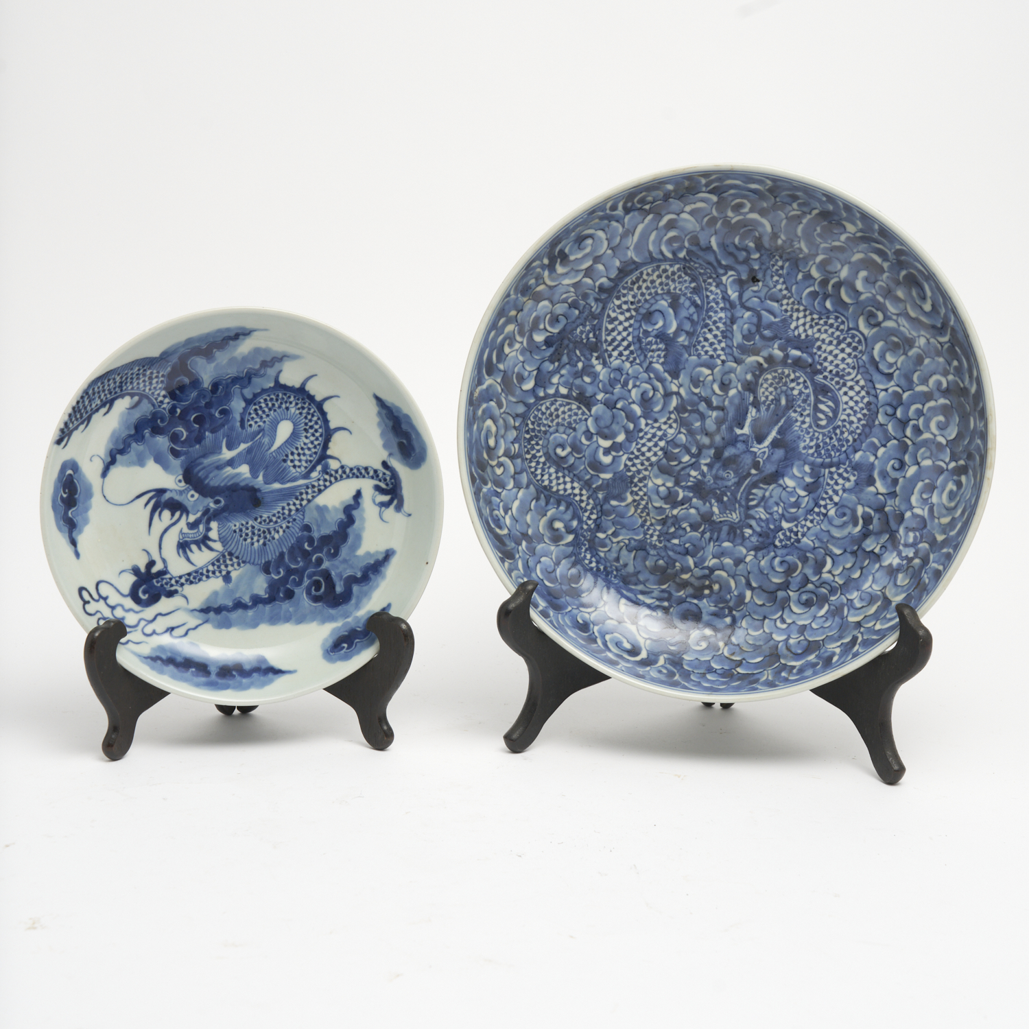 TWO BLUE AND WHITE DRAGON DECORATED DISHES DIA.28CM (LARGEST)