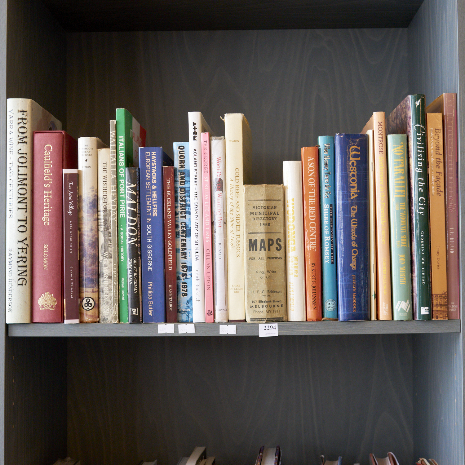 A SHELF OF LOCAL HISTORY REFERENCE INCLUDING SHIRE OF LEIGH, DUNLOP 'WODONGA', SOLOMAN, AND 'CAULFIELD HERITAGE'