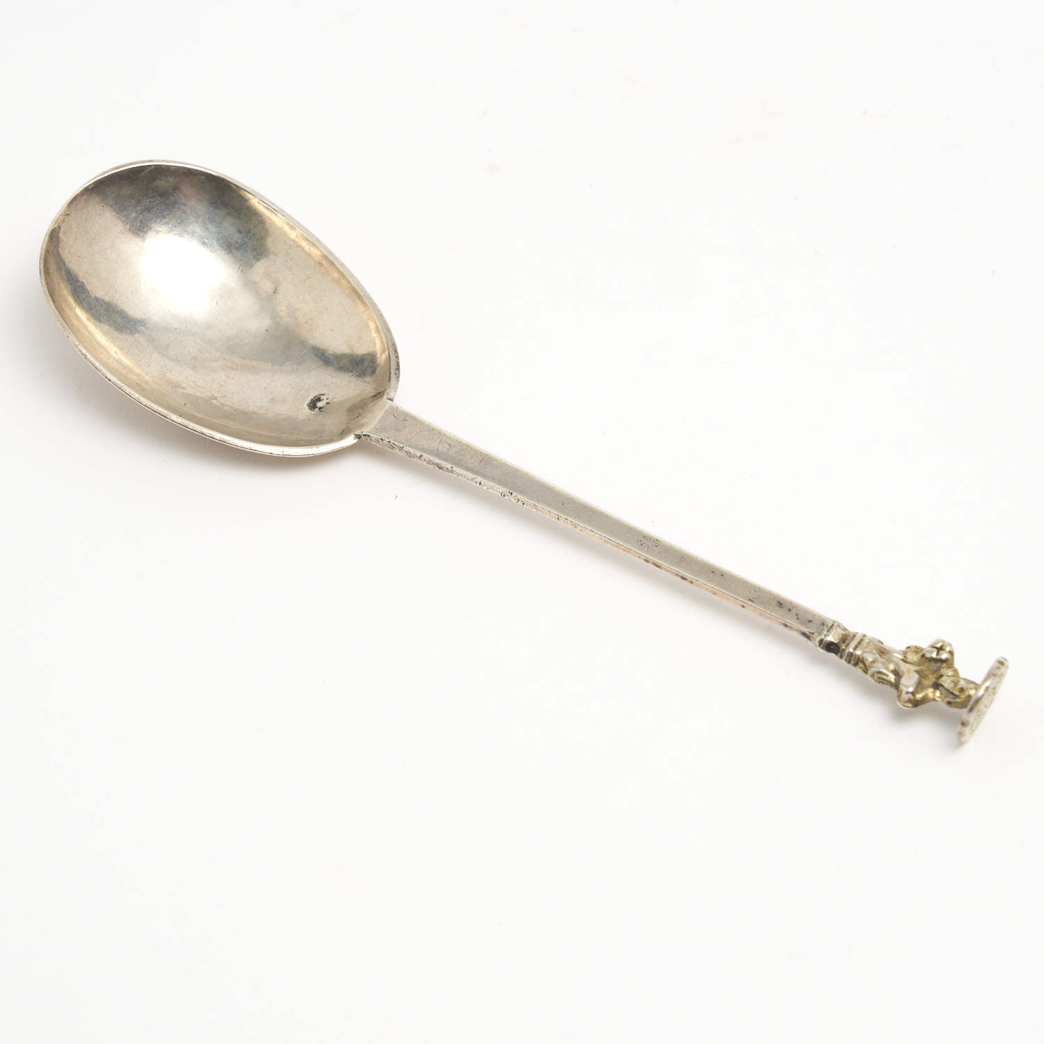 A STERLING SILVER APOSTLE TOP SEAL SPOON, MARKED 1671, WITH TUDOR ROSE TO TOP 50G, H.19.5CM