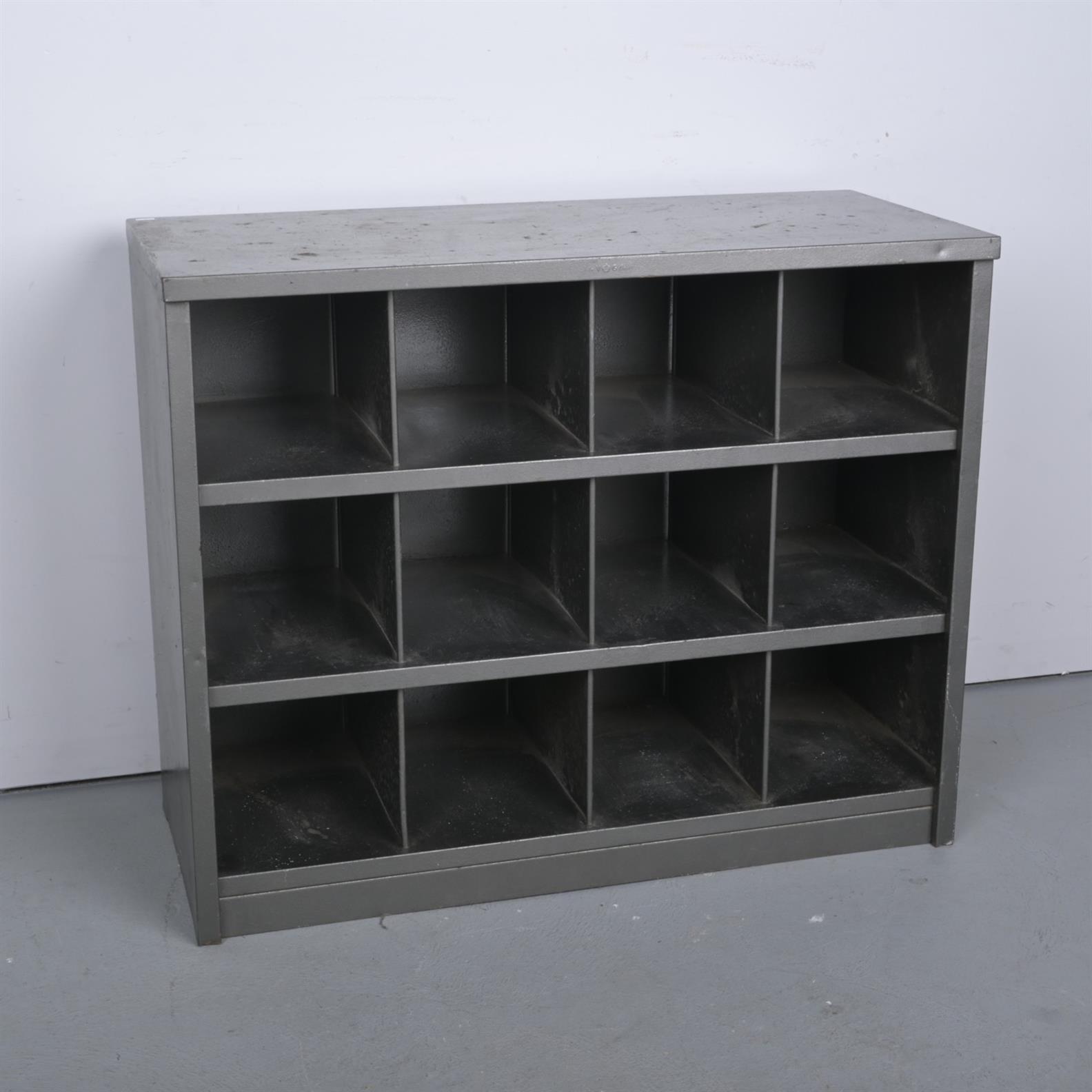 AN INDUSTRIAL METAL PIGEON HOLE SHELF (H76 W94 D41 CM) (THIS ITEM MUST BE REMOVED BY CARRIERS AT THE CUSTOMER'S EXPENSE. LEONARD JOEL STAFF CANNOT ASSIST CARRYING THIS ITEM.)
