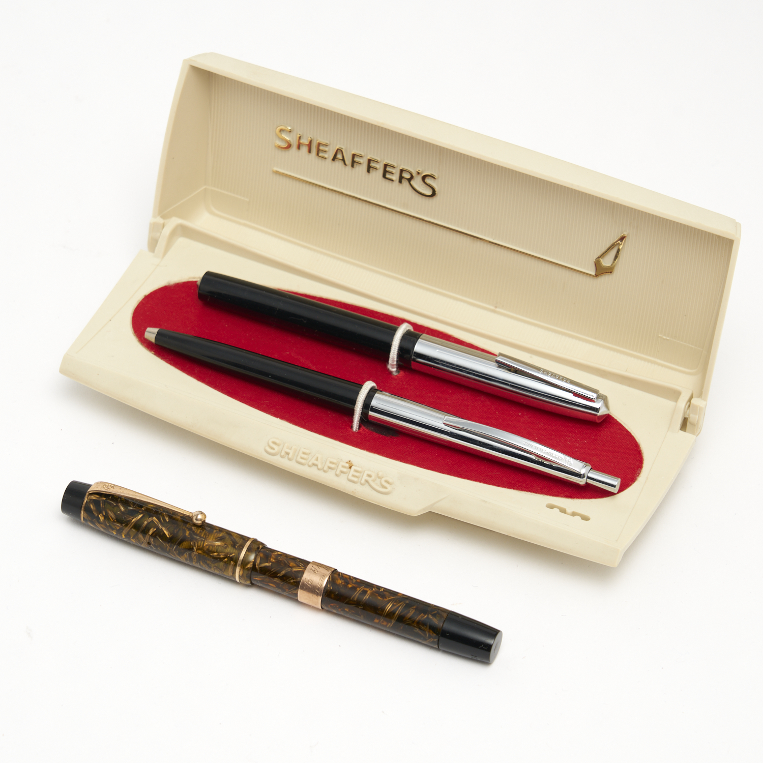 A ONOTO FOUNTAIN PEN WITH 14 KARAT GOLD NIB, TOGETHER WITH TWO SHAEFFER'S PENS ALL IN ORIGINAL BOXES L.15.5CM