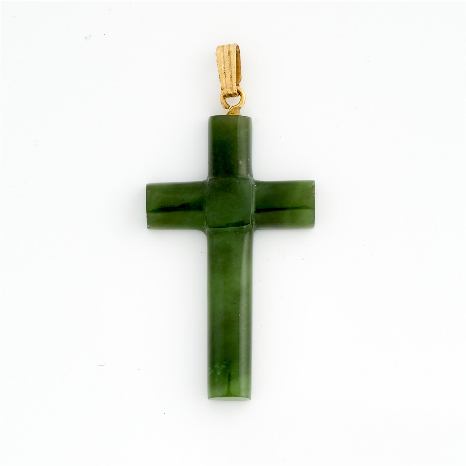 A NEPHRITE PENDANT TO A BAIL IN GOLD PLATE, 45 X 21MM