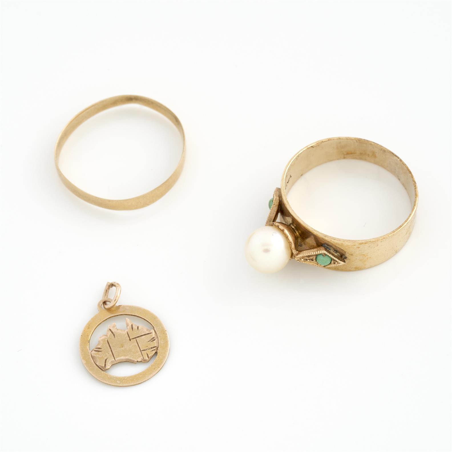 WILLIS & SONS, AN ANTIQUE AUSTRALIAN PENDANT IN 9CT GOLD, TOGETHER WITH A VINTAGE PEARL RING IN 9CT GOLD, SIZE Q AND AN ANTIQUE WEDDER IN 18CT GOLD, SIZE O, 4.8GMS