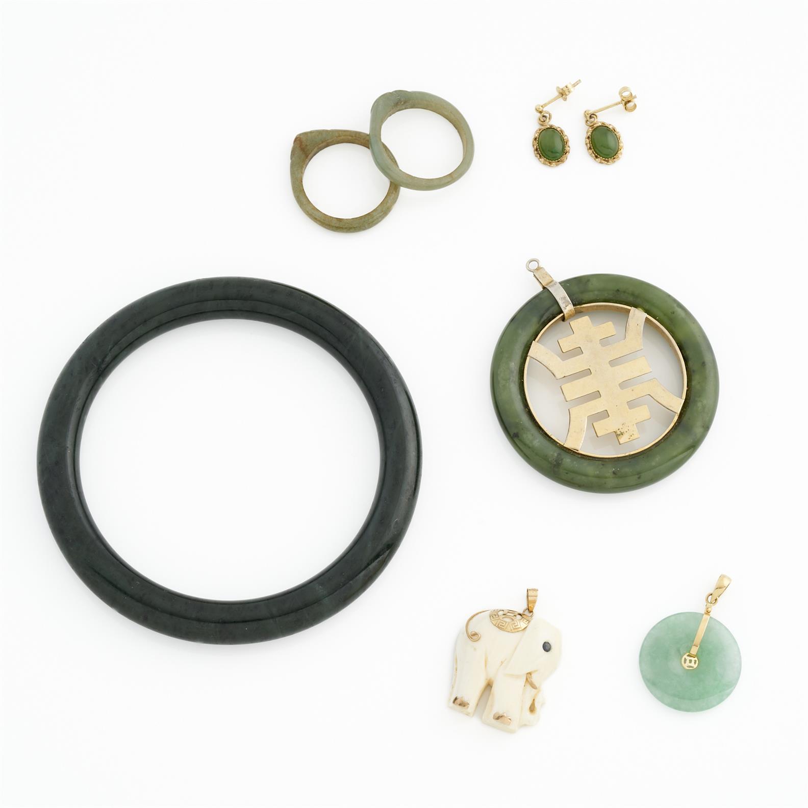 A COLLECTION OF NEPHRITE AND JADE JEWELLERY, INCLUDING A BANGLE, TWO RINGS, THREE PENDANTS AND A PAIR OF EARRINGS