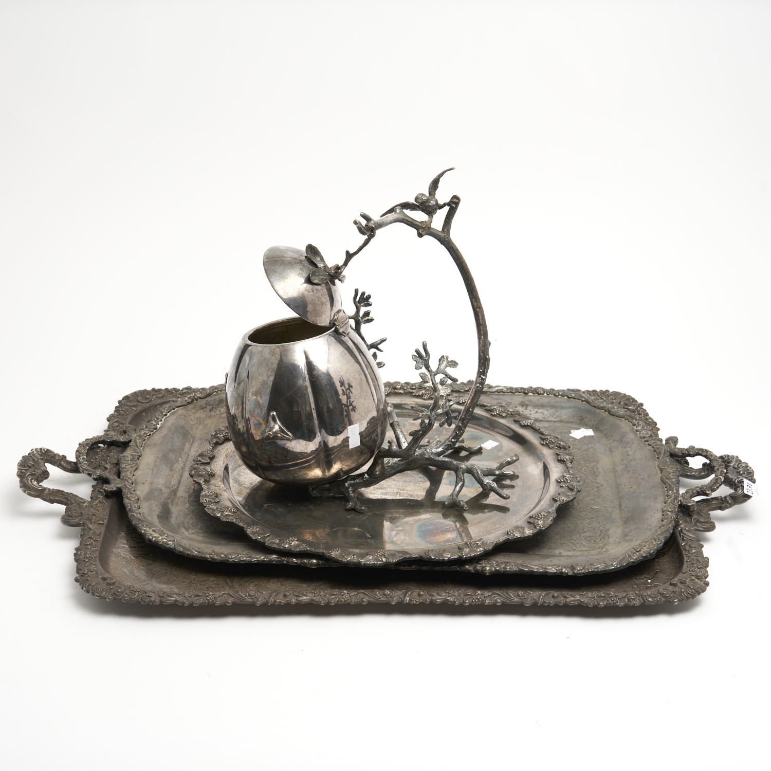 A COLLECTION OF DECORATIVE SILVERPLATE TABLE WARE INCLUDING TRAYS L.65CM (LONGEST)