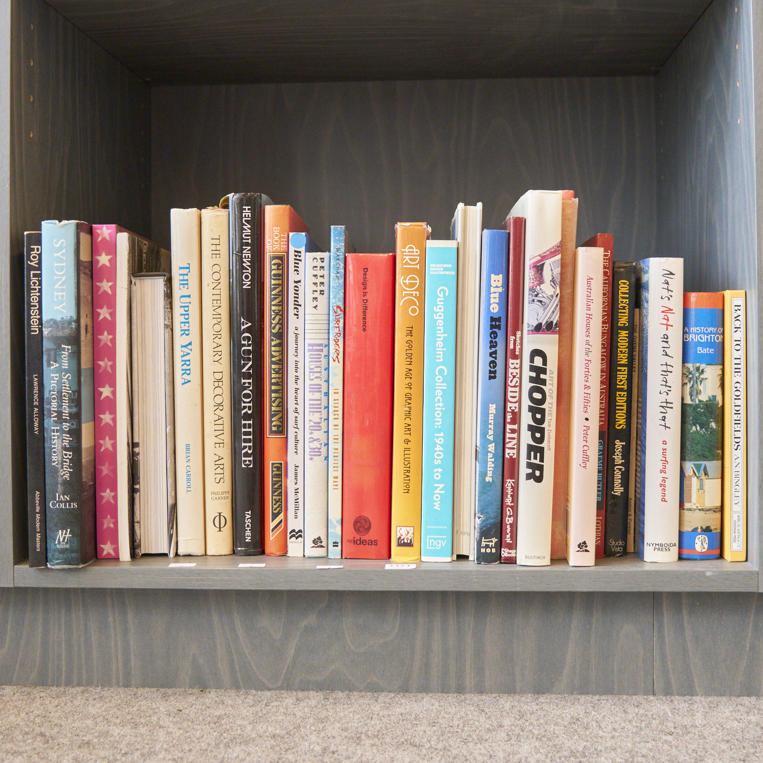 A SHELF OF PREDOMINATELY ART AND DESIGN REFERENCE INCLUDING ART DECO, ART OF THE CHOPPER, AND ROY LICHTENSTEIN