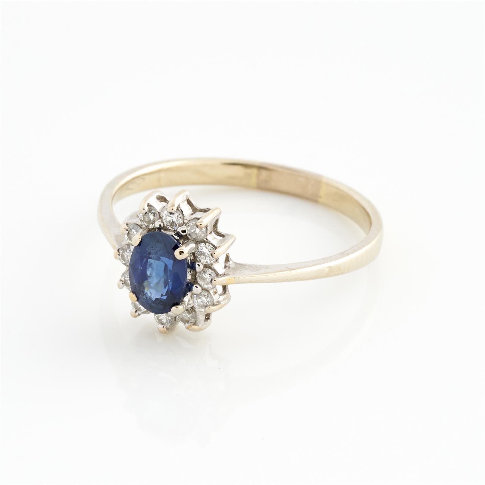 A SAPPHIRE AND DIAMOND RING IN 18CT WHITE GOLD, SIZE P, ACCOMPANIED BY A VALUATION