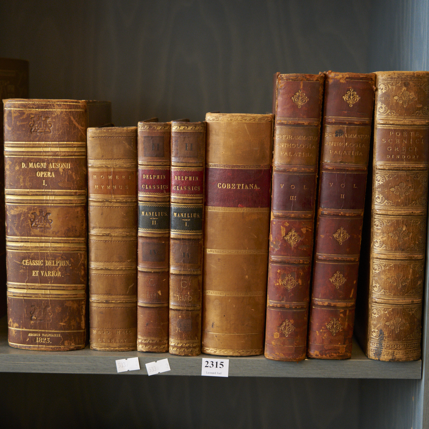 A PART SHELF OF ANTIQUE DECORATIVE BINDINGS