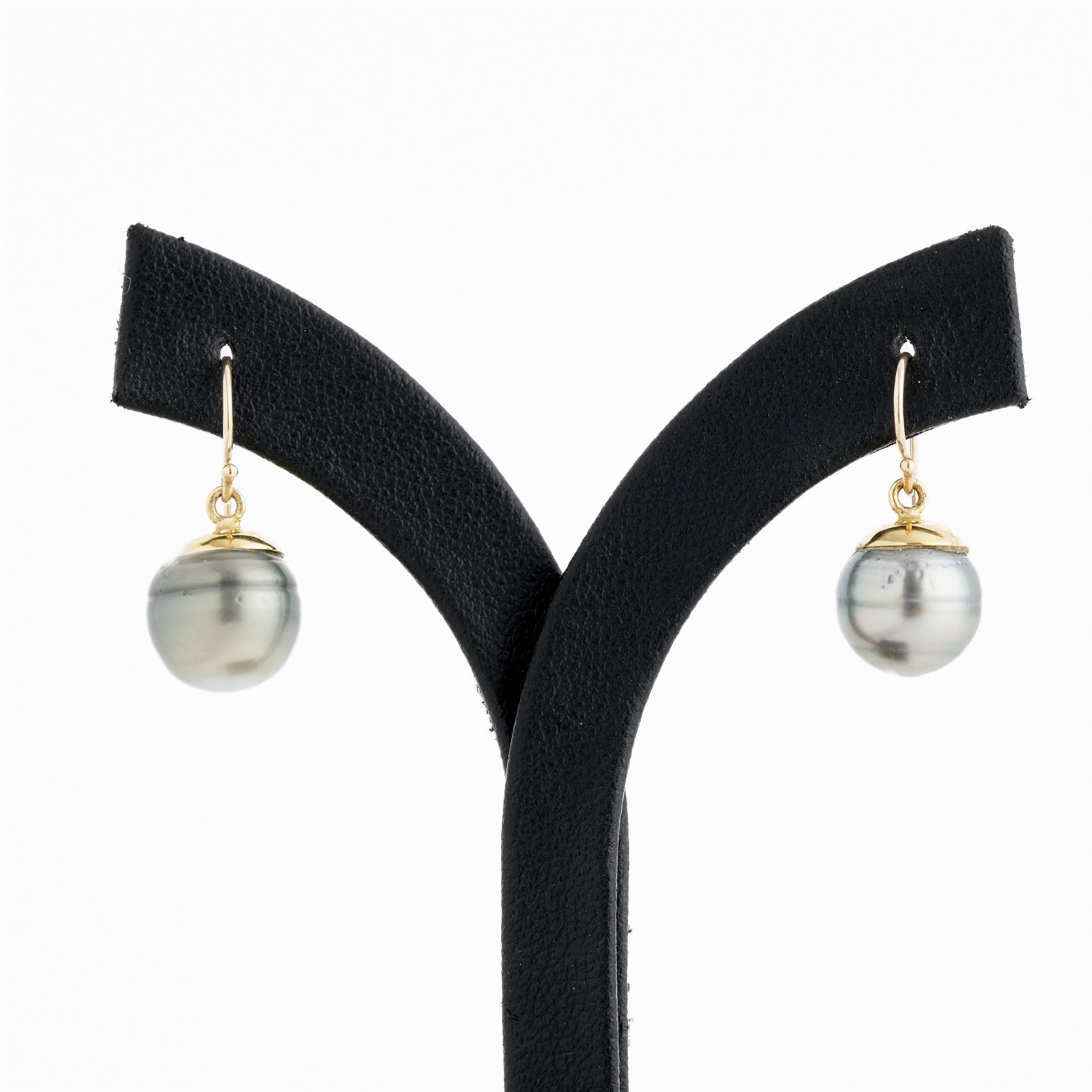 A PAIR OF TAHITIAN PEARL EARRINGS IN GOLD, TO SHEPHERD HOOK FITTINGS, 20MM
