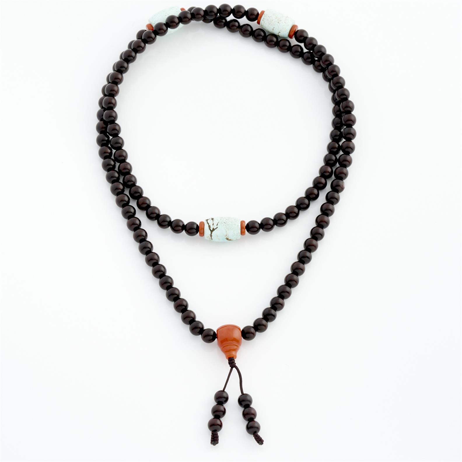 A LONG STRAND OF WOODEN BEADS WITH HARD STONES SPACERS, 920MM