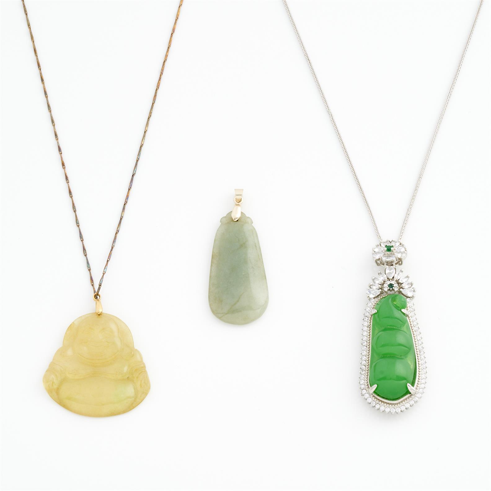 A COLLECTION OF THREE JADE PENDANTS IN BASE METAL, LARGEST PENDANT MEASURING 62 X 22MM