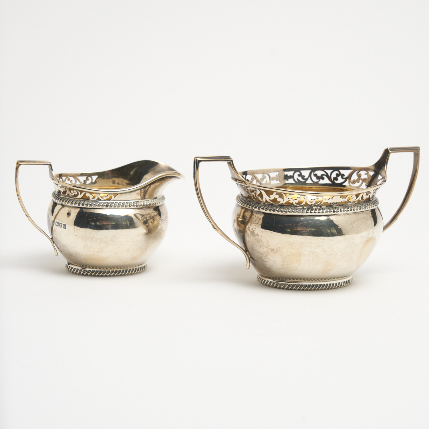 A STERLING SILVER CREAMER AND SUGAR BOWL WITH RETICULATED DECORATION 300G W.17CM