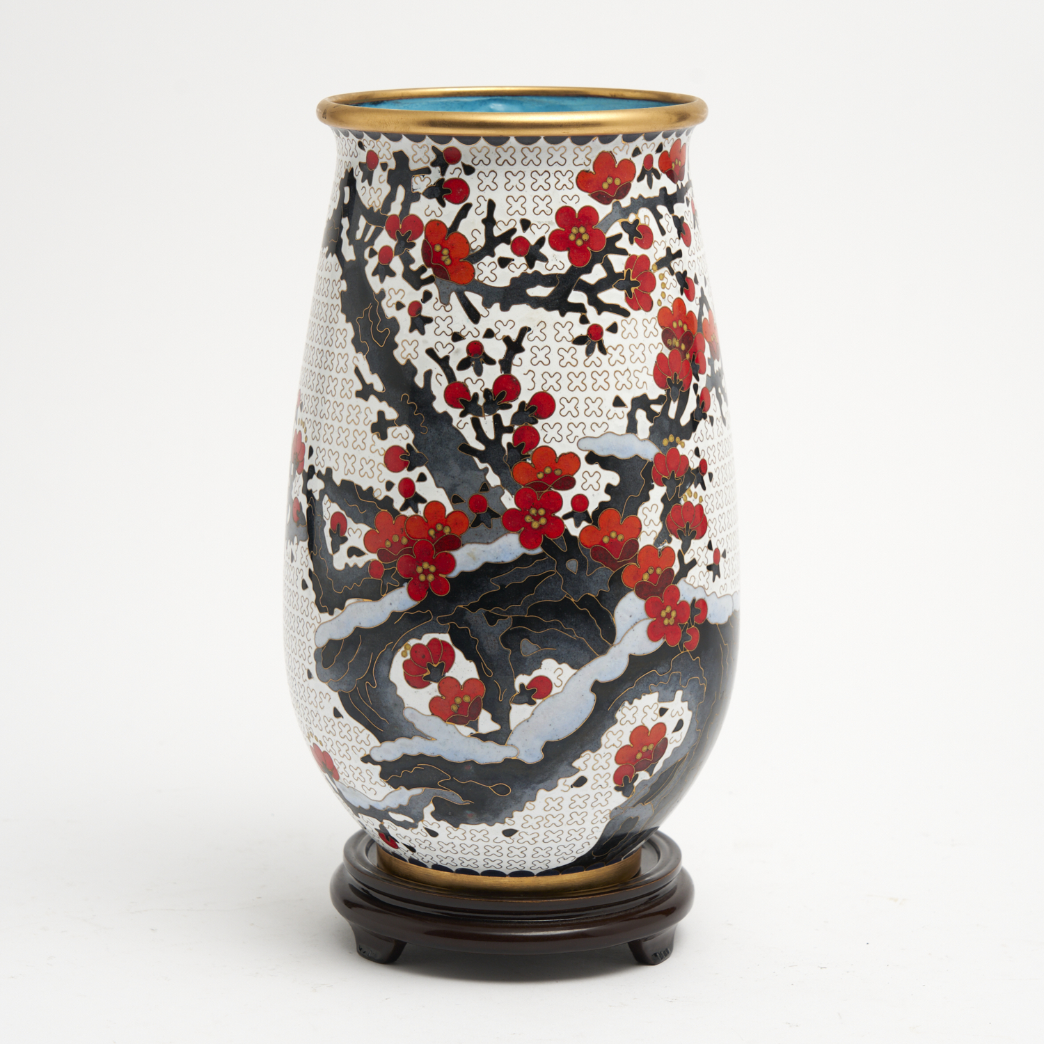 A CLOISONNE VASE WITH TURQUOISE INTERIOR AND DECORATED WITH RED BLOSSOMS, ON TIMBER STAND H.29.5CM