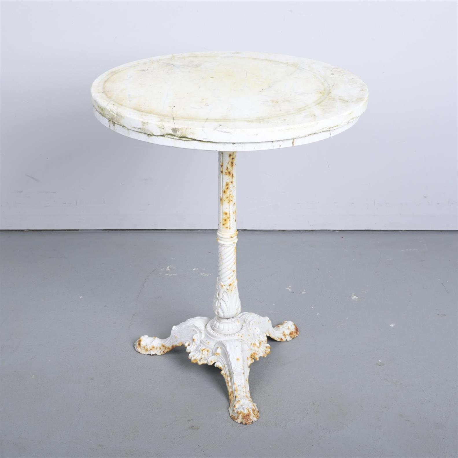 A CAST IRON AND STONE GARDEN TABLE (A/F) (75H X 63DIA CM)