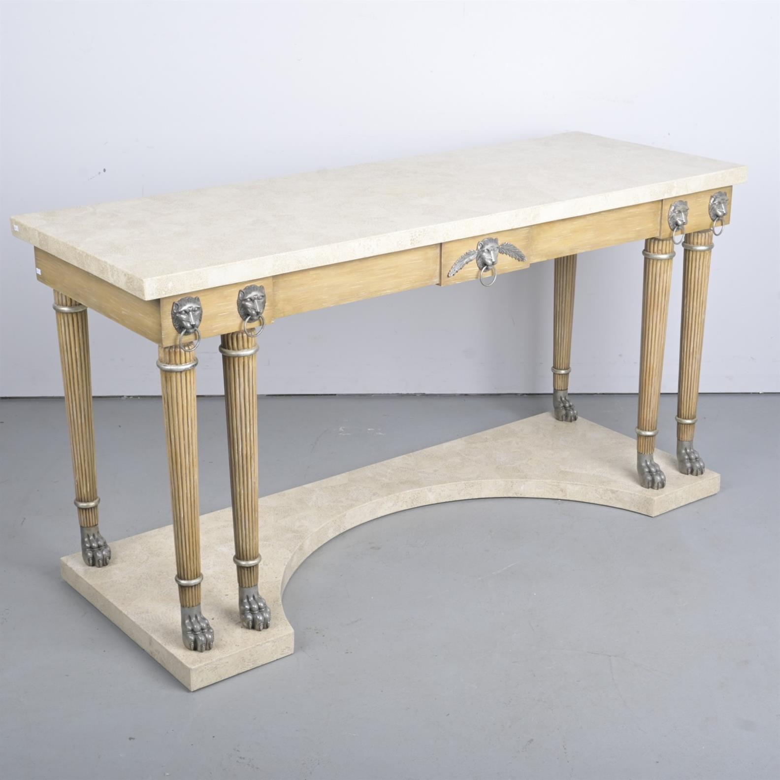 A TWO TIER SIDE TABLE WITH STONE TOP AND BASE BY MAITLAND SMITH (88H X 168W X 61D CM) (THIS ITEM MUST BE REMOVED BY CARRIERS AT THE CUSTOMER'S EXPENSE. LEONARD JOEL STAFF CANNOT ASSIST CARRYING THIS ITEM.)'